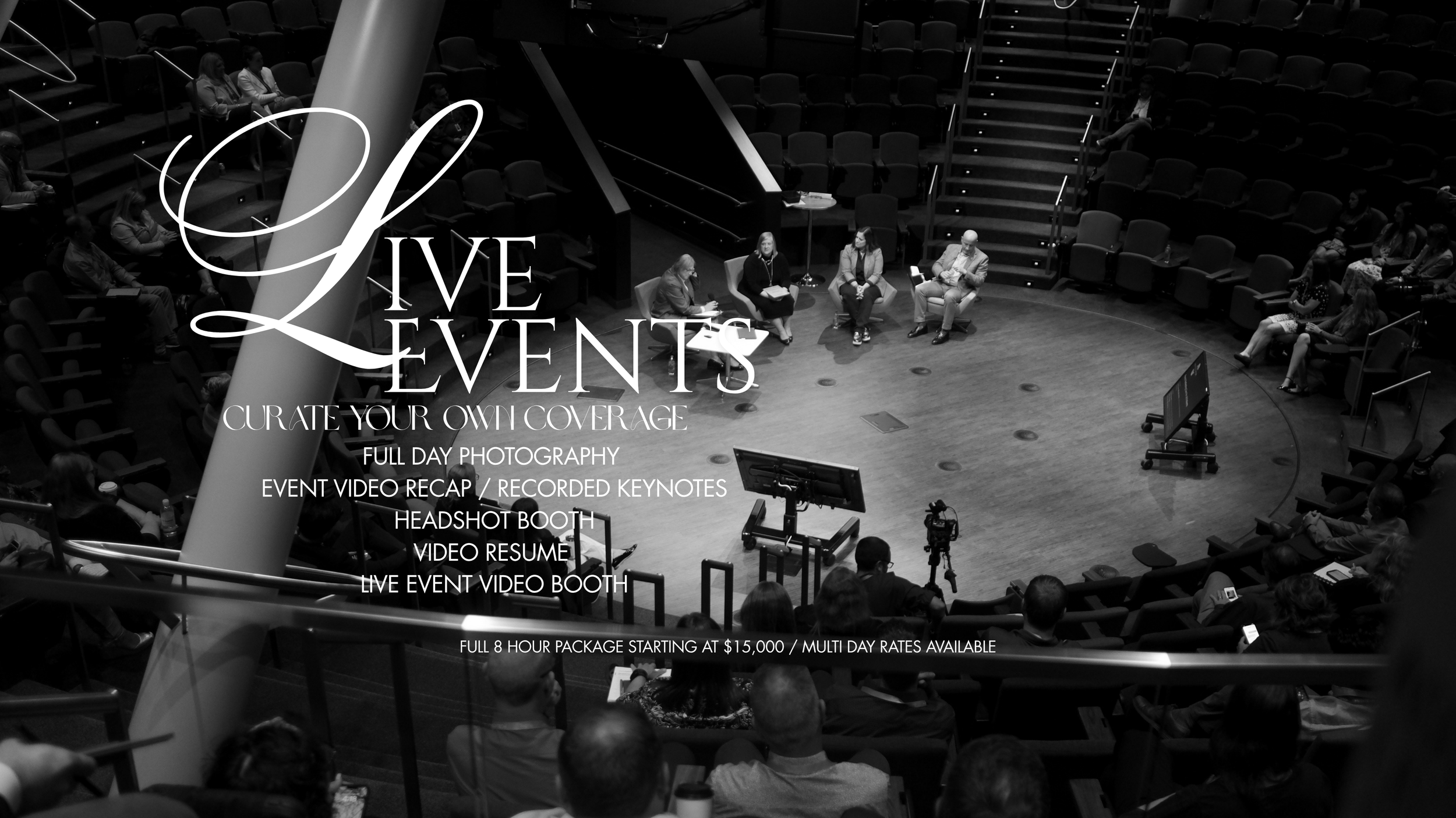 For live corporate events such as showcases and seminars, if we agree on a date, the package is an all day package where we together decide what is the best possible option for what fits your needs. Live event material is returned within the week that it’s shot.